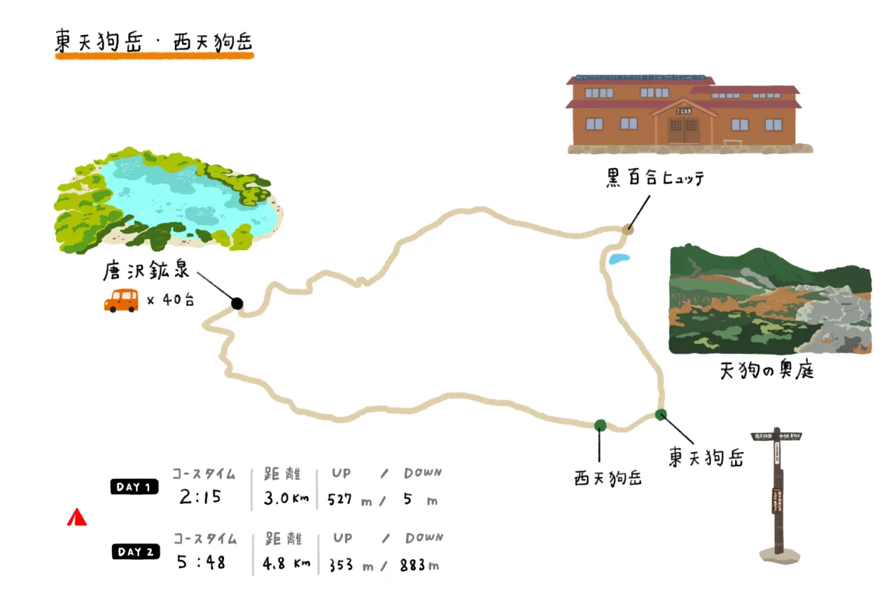 黒百合ヒュッテと東天狗岳、西天狗岳を通る周回コースを、2日間たっぷり時間をかけて時計回りで歩きます。