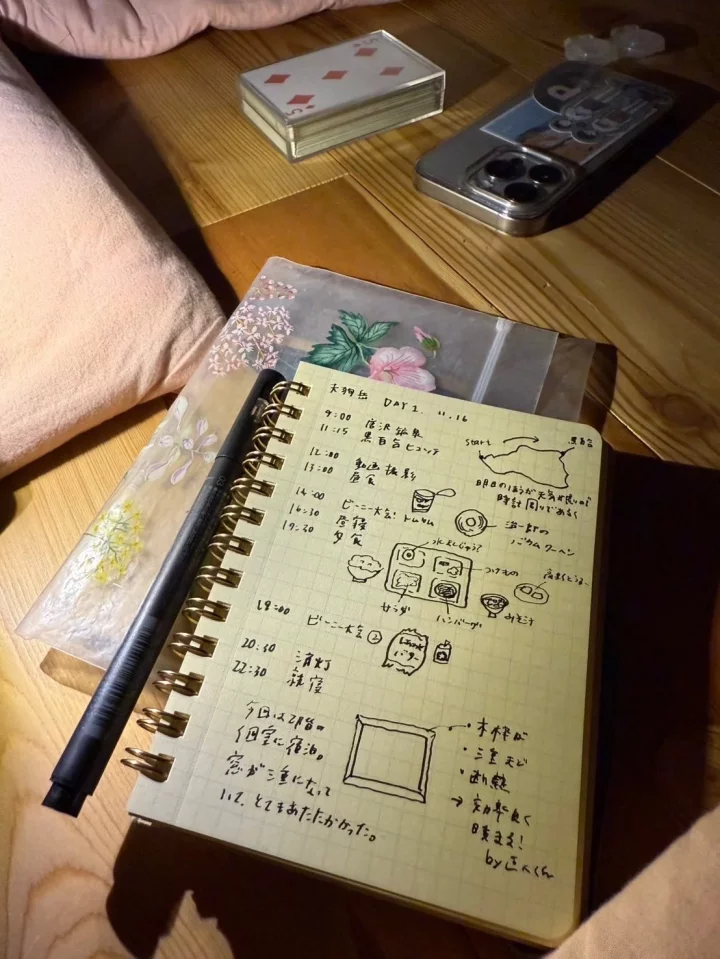 眠たくなってきたので、各々好きな時間を過ごす。ジュンは今日の山ノートを。私は持ってきた文庫本を読む。でもすぐ眠たくなっちゃった。布団がおばあちゃんちみたいな硬さ。ちょっと年末みたいな気持ち。おやすみなさい。