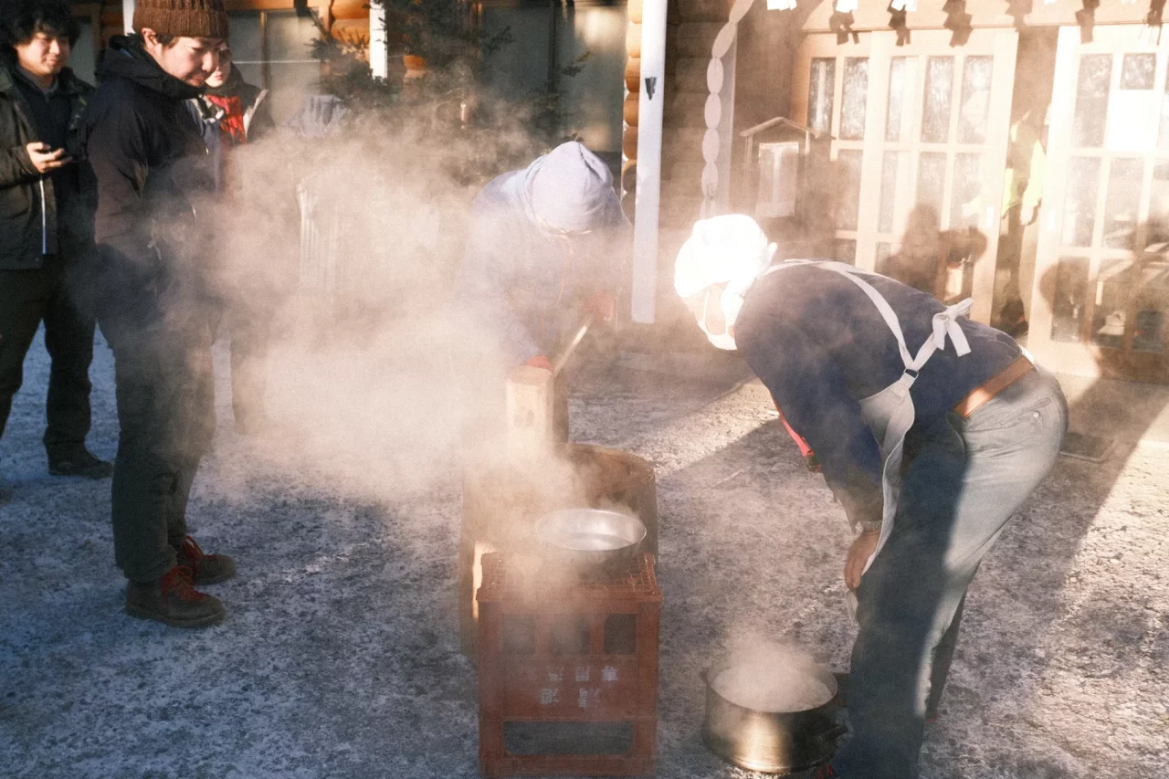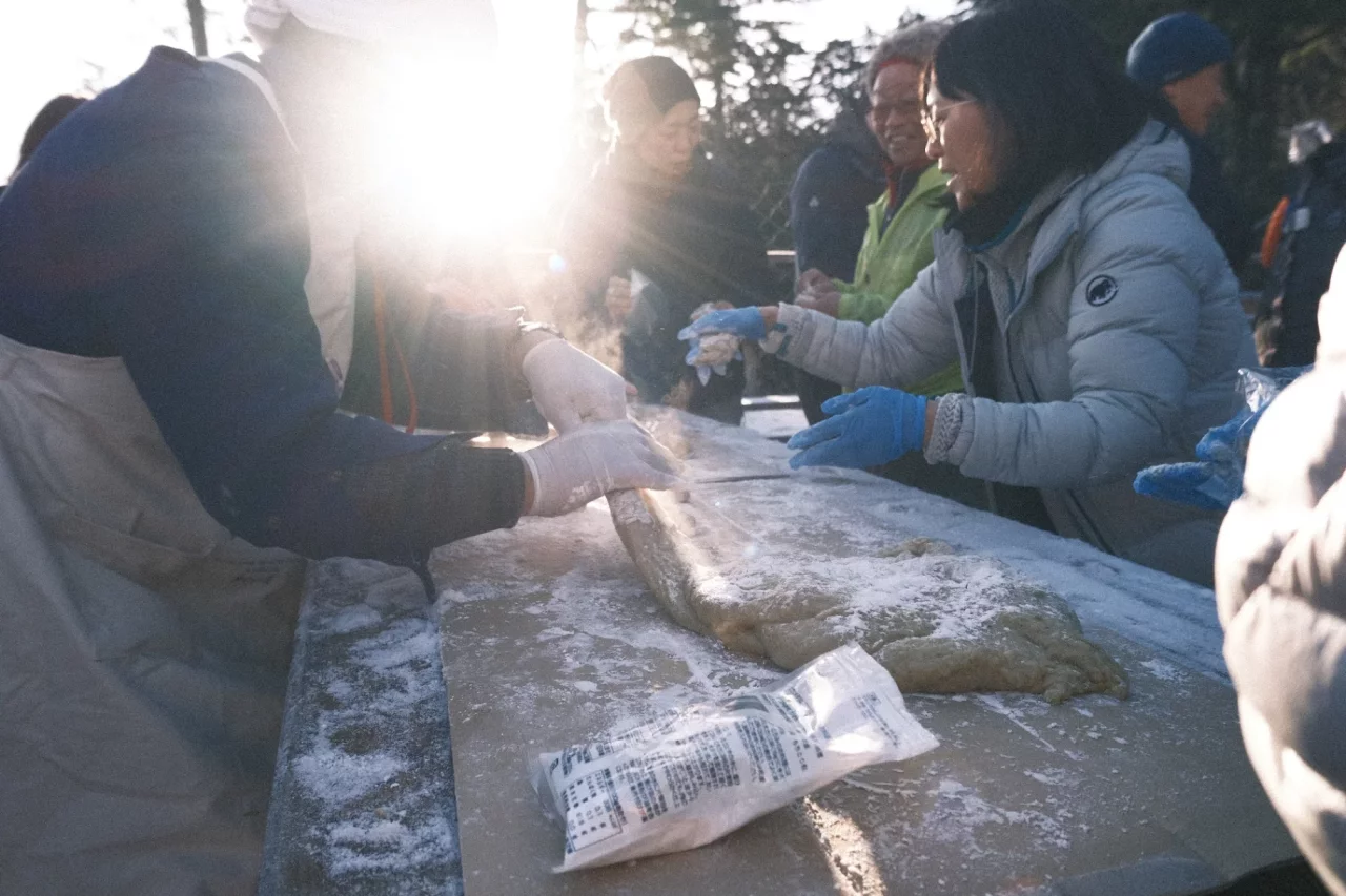 山頂から下山したら、餅つき大会がちょうど始まるところだった。登山客たちが火の元に集まってひしめき合って暖をとっていて可愛かった。餅つきは、初めは小屋の人がすり潰すようにくるくる周り、その後水をつけながらいわゆる「ぺったんこ」が始まった。餅つき大会をちゃんと見るのは初めてな気がした。
