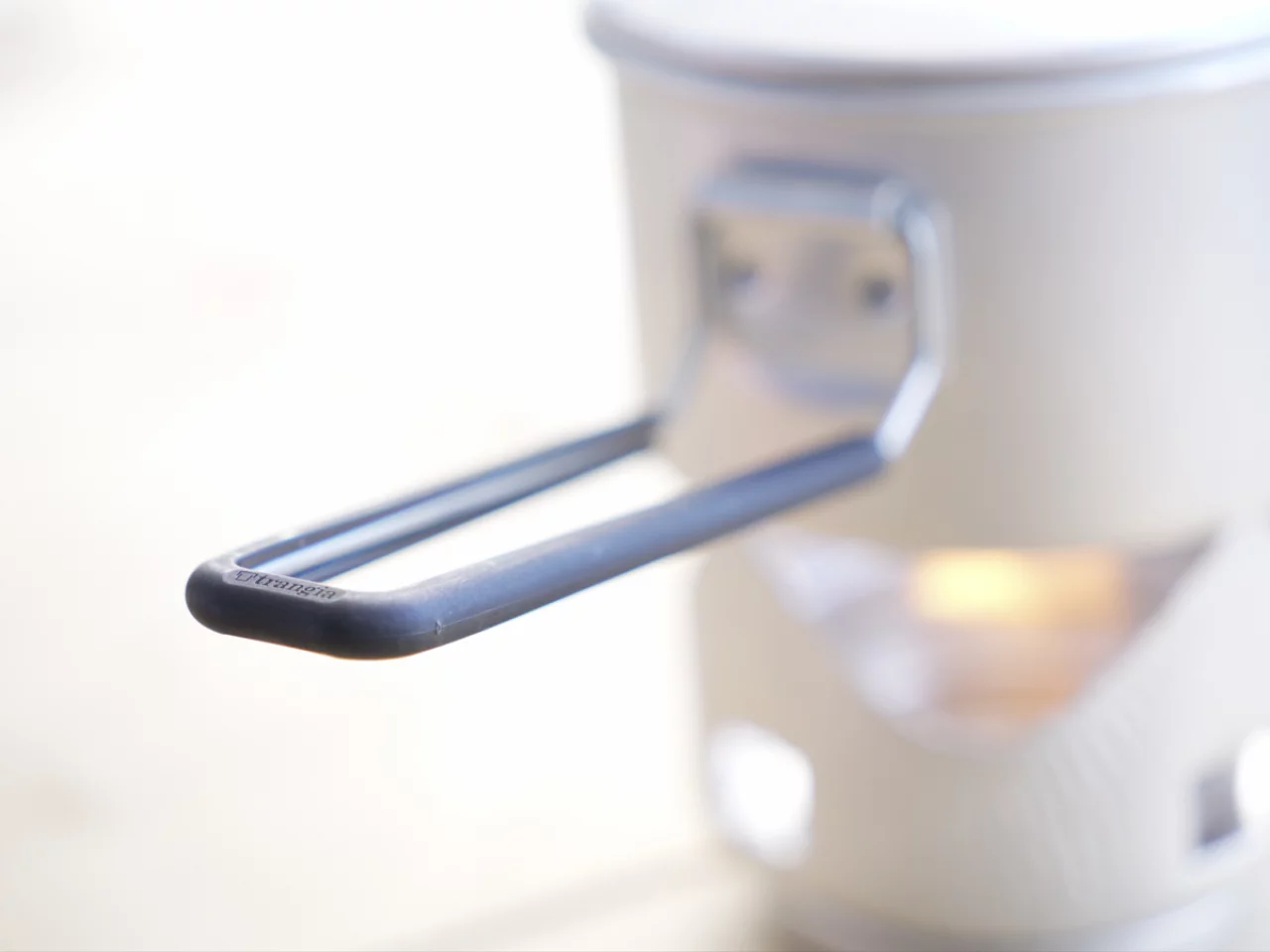 ジェルや固形燃料用のバーナーと風防一体型のゴトクは500mlの蓋付きクッカーに収納することができ、ハンドルを180度回転させて蓋を固定することができるデザインです。