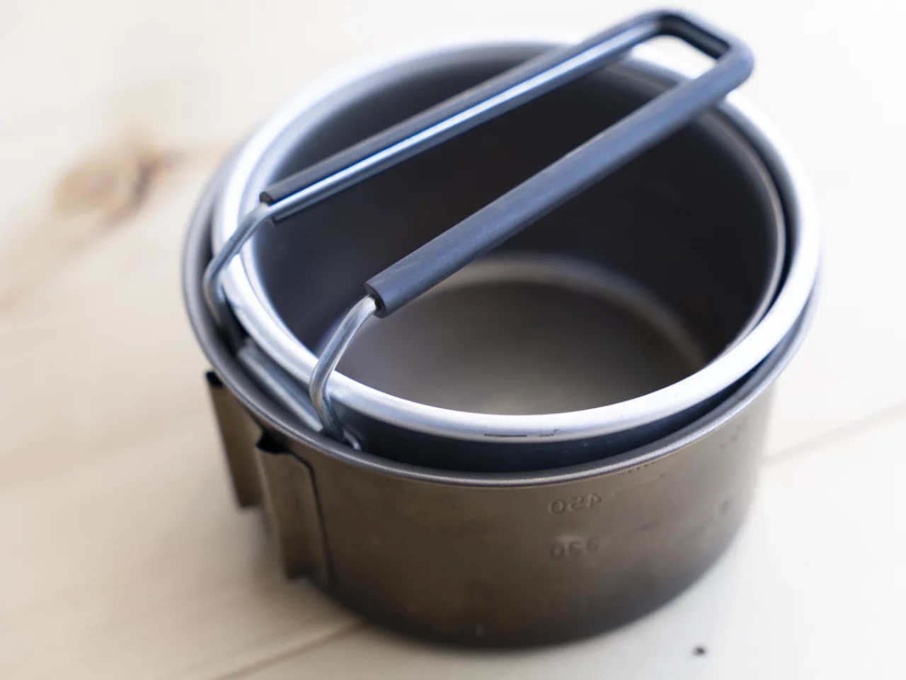 トランギアの「マイクロライト」は実容量が400mlですが、ボコボコと沸騰させなければ500mlお湯を沸かすことができます。内側には100mlずつのメモリがついており、500mlの目盛りはクッカーの口から約0.5cm下に位置しています。