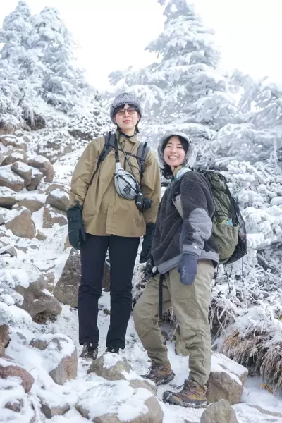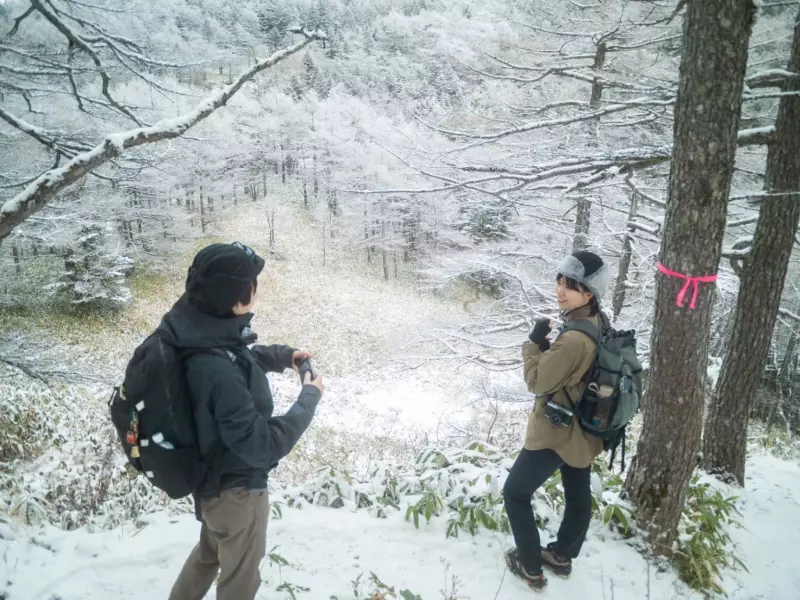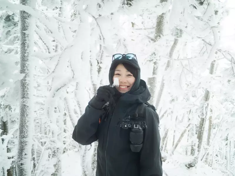 森に入ったところからもう雪が積もっていて、1年前が懐かしい〜!となった。雪山って、雪のつき方とか凍り方で普段の植物がそれぞれ違う形になって、それが絶妙にオシャレ頑張ってる感じになって可愛いんだ。しょっちゅう足を止めて、これはトッポだ、これはカニの身だなどと盛り上がった。