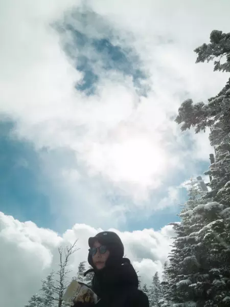 山頂までの道の林、枝に雪が積もったり凍ったりしてるんだけど、雪の重みで枝が垂れ下がっていて、枝がいつもより近くに感じられて、トンネルを通っている感覚だった。葉っぱがある枝は、その上に雪が積もるから、裏から見ると魚の骨みたいになっていておもろかった。