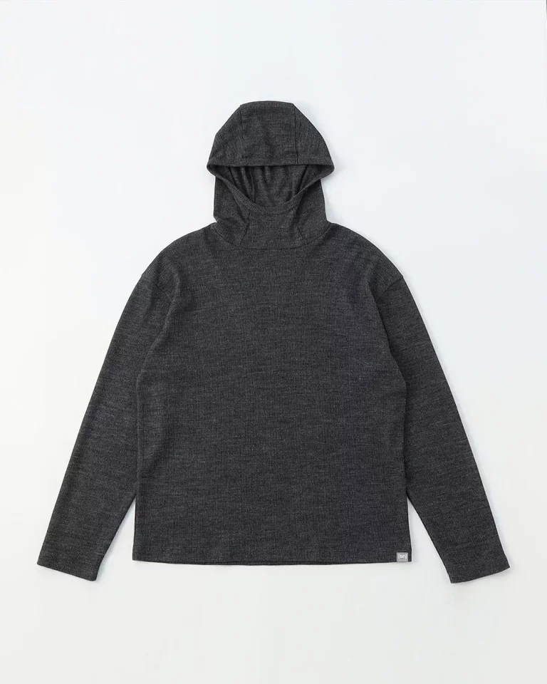 袖の内側にはフィンガーループがあり手首を冷やさないように行動することができたり、フィット感に優れたフードは耳や頭を覆い隠すため風が強い場所で活用することができます。またメリノウールは紫外線対策にも優れた素材なので雪山、日差しが強い稜線上を歩く時にも便利です。夏は1枚で、冬はレイヤリングをして、というように汎用性にも優れています。