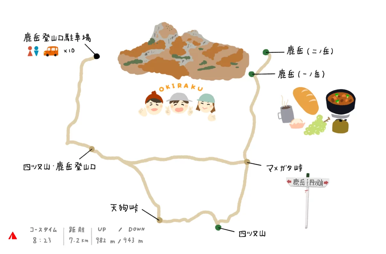 今日の行程です。鹿岳登山口駐車場に車を停めました。四ツ又山・鹿岳登山口から入山し、分岐から天狗峠を通って四ツ又山登頂します。母たちは私たちのおもてなし準備があるとのことで、マメガタ峠まで緩やかな登りでショートカット。鹿岳は2つのコブのような山頂がある山で、一ノ岳、ニノ岳と順にピークハント。一ノ岳の山頂付近でお気楽隊と合流し、それぞれの山頂でおもてなしされながらたっぷり休憩をとりました。距離7.2km、獲得標高982mでしたが、のんびりしすぎて8時間23分も山の中にいたけど、そのうちの3時間は休憩でした。