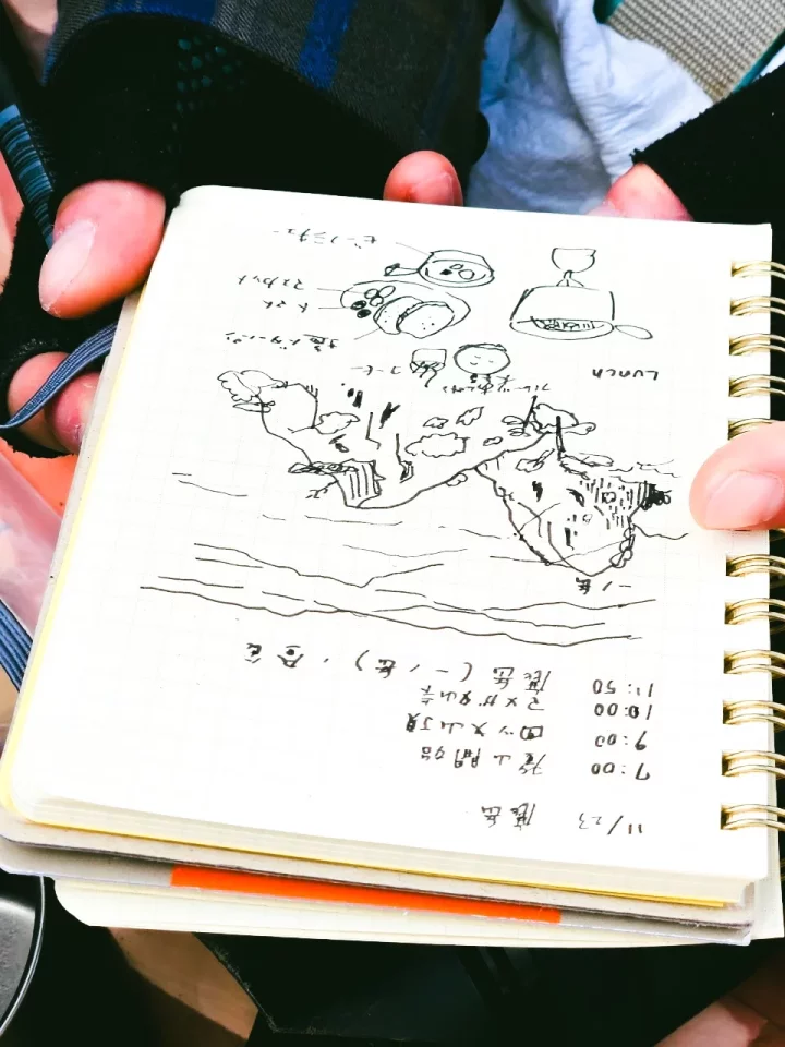 二ノ岳を登る。私たちの方が先に山頂についた。上から母たちがまだ遠くにいるのが見えまだ時間がありそうだったので、その時眠たすぎた私は適当なスペースを見つけてザックを枕にして昼寝をした。その間、ジュンはあの特徴的な山頂をスケッチしていたらしい。