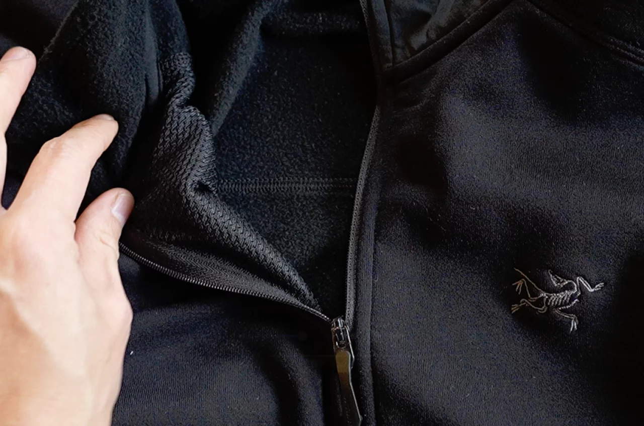 ジッパートップの裏側にはチンガードが備わっています。これはファスナーの金具が顎や口元、喉部分に直接触れず、不快感を軽減してくれるもので、内側に目立たないような形でついています。