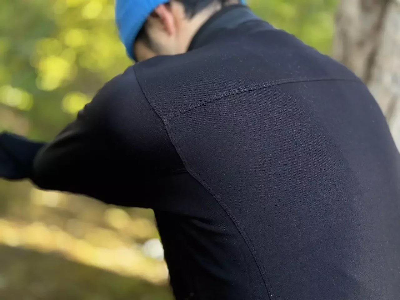 アークテリクスのウェアは裏返すと細かなパネルの組み合わせで体の形に沿った立体裁断がなされていることがよくわかります。腕を振った時の突っ張り感の無さ、動かない時に感じるウェアの重量感の少なさ=着用感が少ない体への程よいフィット感が特徴で、これは着心地の良さだけでなく着用した時の見た目の良さにも貢献しています。