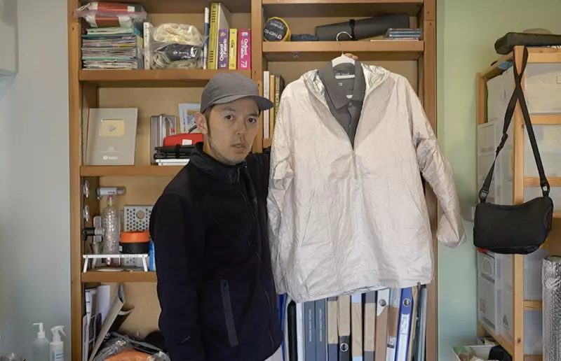 2025年に発売を開始する今までにないレイヤリングアイテムです。こちらはフリーサイズで男女兼用、高密度ポリエチレン不織布タイベックシルバー製のアノラックです。タイベックシルバーは、高密度ポリエチレン不織布タイベックにアルミニウムを蒸着させ、さらに繊維の一本いっぽんにアルミニウムの劣化を防ぐ抗酸化樹脂コーティングを施した遮熱シートです。