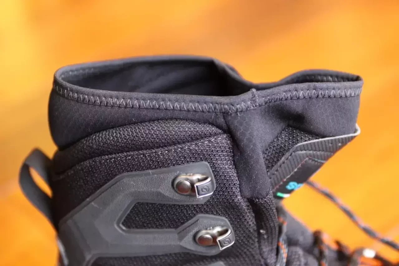 軽量ですが、冬用登山靴らしいしっかりとした剛性感があります。足入れはスムーズで、足首まわりはアッパーとタンが一体となった「ソックフィットシステム」により、心地よいフィット感を実現。さらに、ゲイター装備で雪や小石などの侵入を防ぐと共にヒートロスを防止します。足首まわりは柔軟性が非常に高く、足首の自在な動きを妨げません。