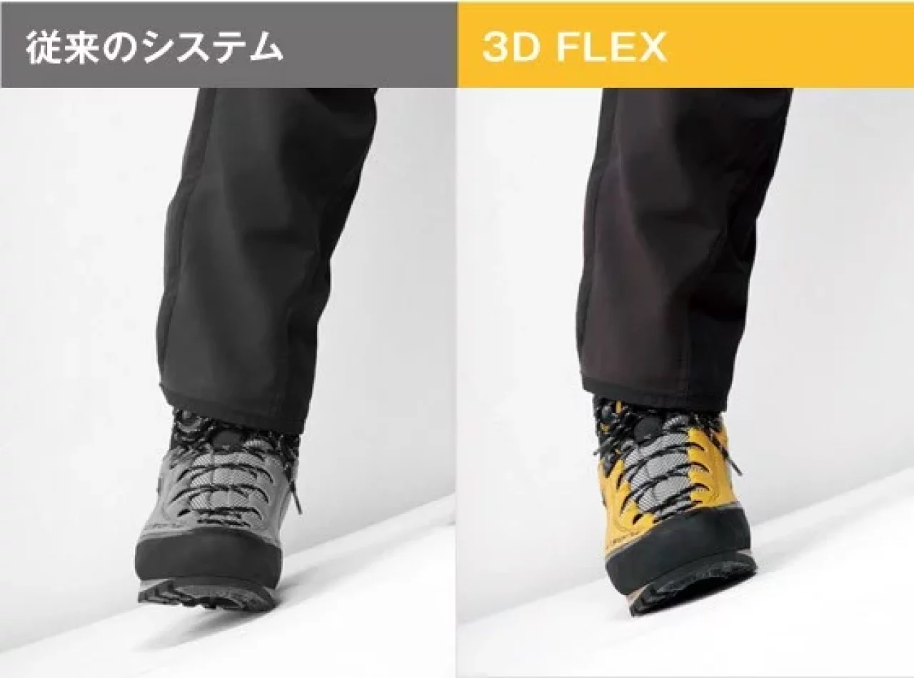 足首まわりはしっかりとサポート性がありながら、柔軟性、屈曲性に優れた「3D FLEX」システムを採用。足首を自由に動かすことができるため、急斜面や岩場でもソール全体で接地でき、スリップしにくいです。