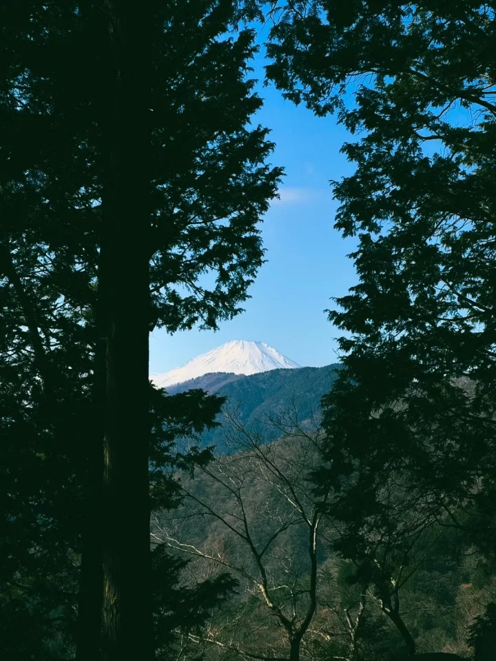 堀山の家に着いた時、11時半だった。ちらほら休憩している人がいるので、うちらもお昼を食べるか聞いたけど、もっとお腹を空かせてから食べたいということで満場一致した。ここは、林の隙間から富士山が見える。ちょうど乾雪したところだけが頭を出しているな。空に溶けちゃいそうなくらい、真っ白な富士山。
