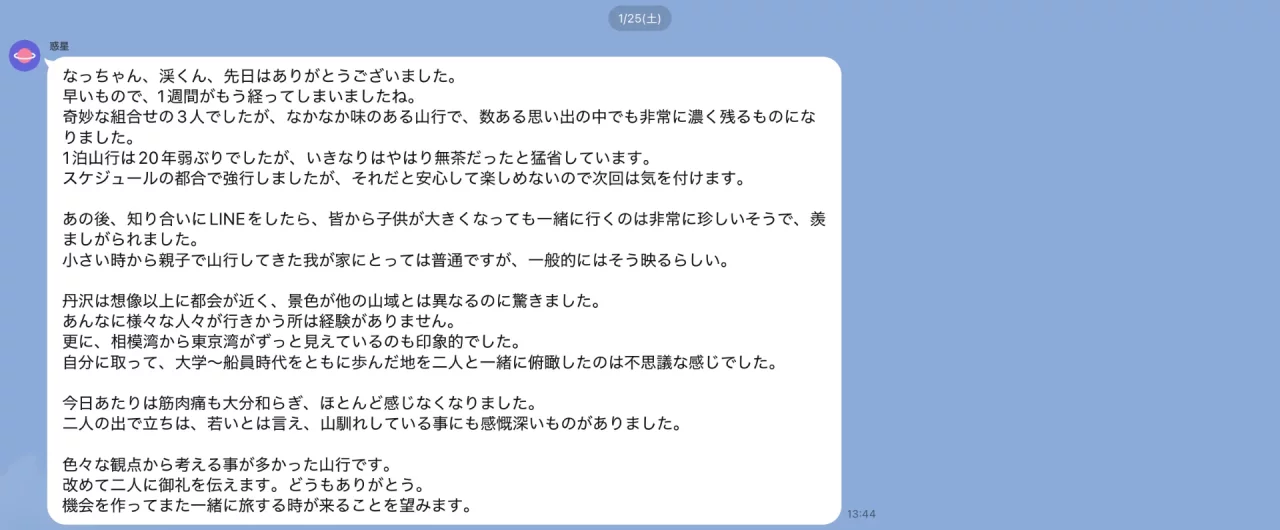 ジュンとばかり山に登っていて、それはもちろん楽しかった。でも、私の手元には意外とたくさん大事な人やものがあるようだから、それを一つ一つ大事にして行くことはしなきゃ行けないなと思うよ。私の人生、ジュンだけがいればいいわけないからね。当たり前だけど。