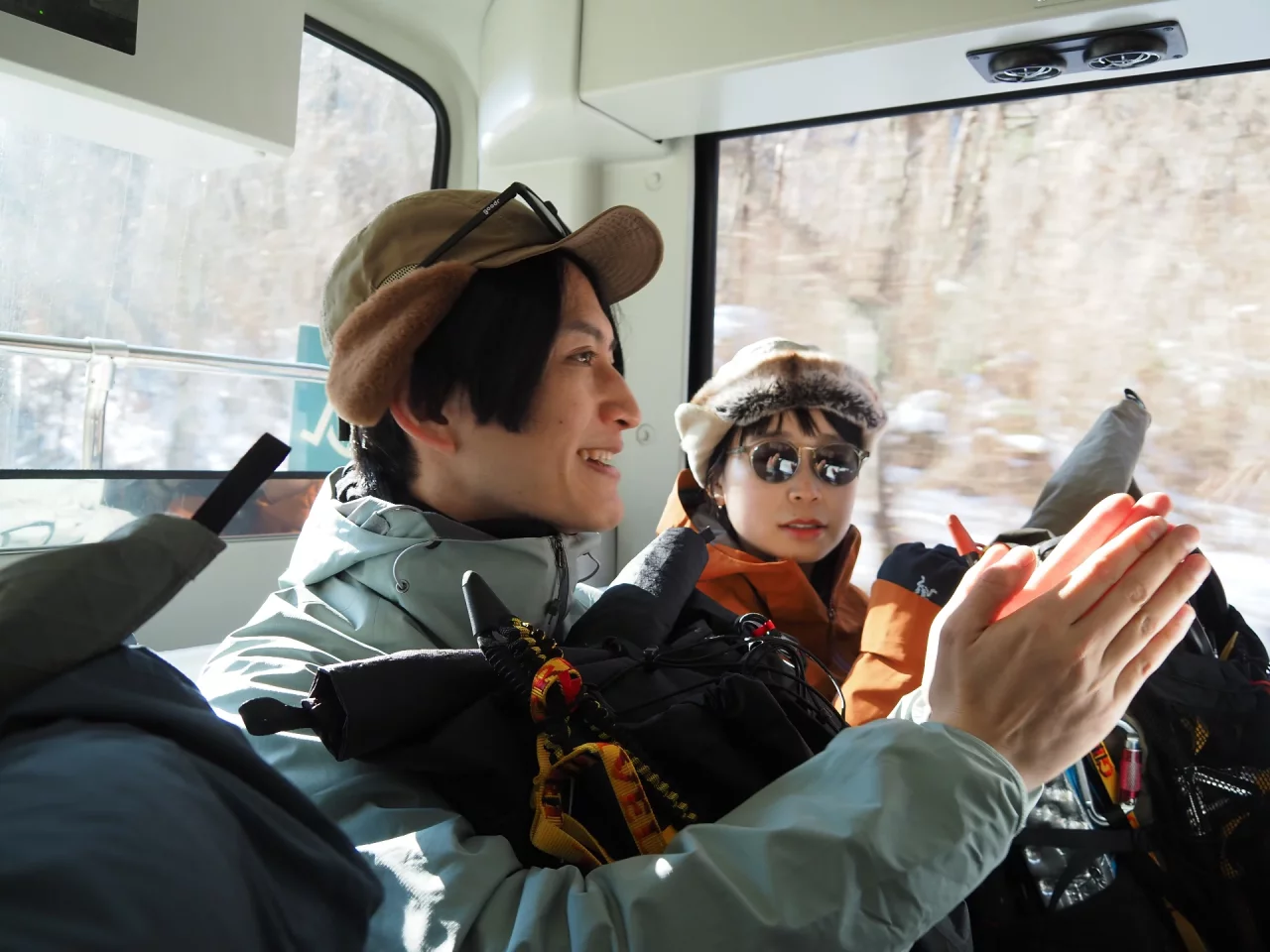 レンタカーしてくれてたスタッドレス車の中でみんなと初めまして。三列シートは遠足みがあって楽しいね。一番後ろの人がザックに囲まれすぎて貨物化しているのも、登山ならではのご愛嬌。今回の貨物担当は大地くんです。5人中2人なので、勢力図的にマイノリティな私たち二人を真ん中のシートにしてくれて、本当にご配慮ありがとうございます。