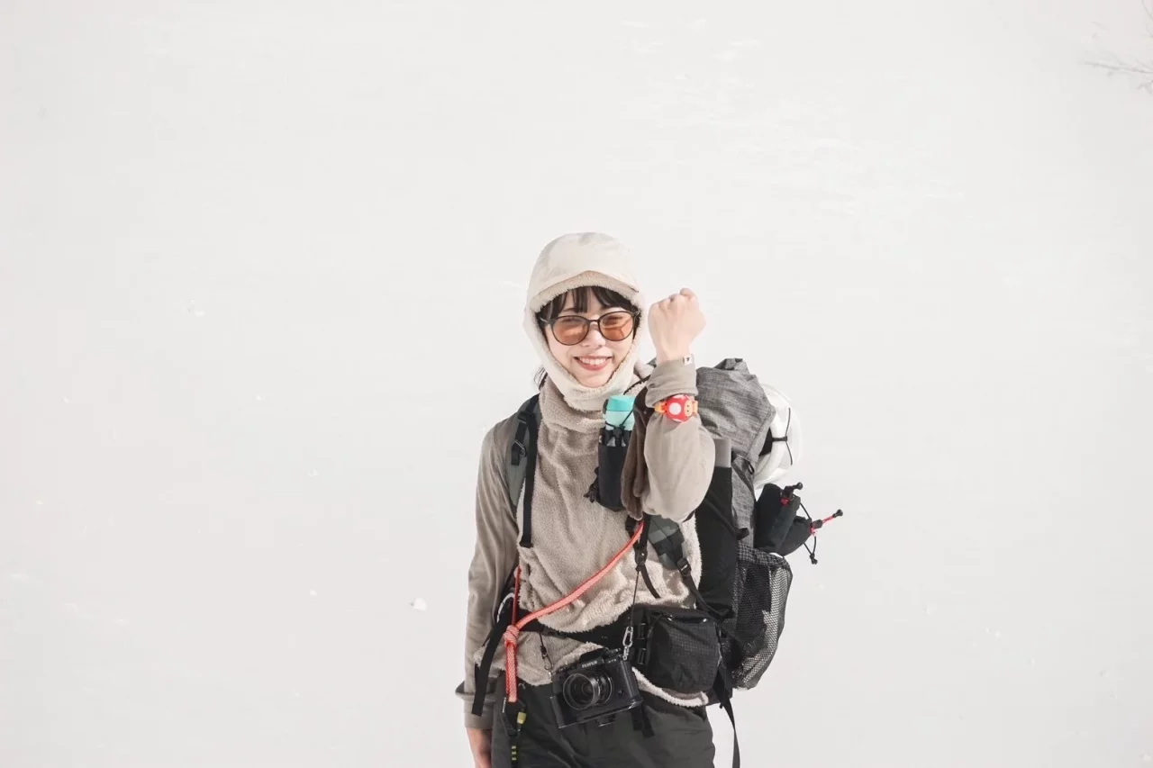 リアルに10歩進んでは休憩。休憩ってか、写真撮影タイム。みんな各々のカメラに良い被写体を収めたく、寝転びながら画角を探す。ひなこちゃんは優しいきなこ色のコーディネートで、お顔の色も白いのでほぼ雪山に溶けていた。