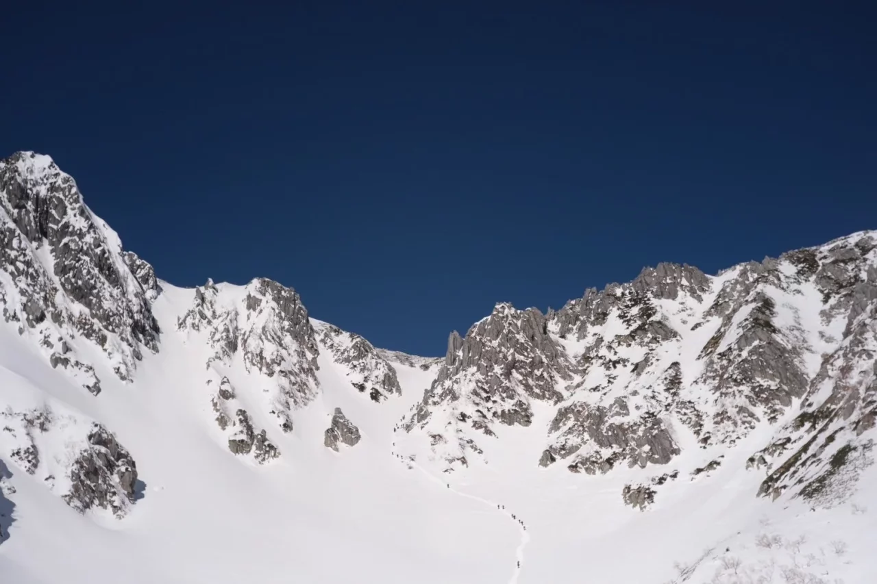 空の青が、青すぎて黒。リアルに言うと群青。雪の白とのコントラストのせいなのかわからないのだけど、それにしても紺すぎる。木曽駒ヶ岳のここの空だけ、空に塗る絵の具の配分を間違えている。実はここだけ、夜なのかもしれない。