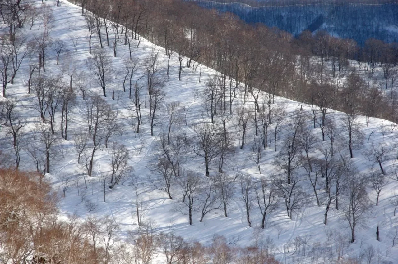 樹林帯の中は緩やかな登り、昨日までの積雪も沈降しラッセル不要、シールでの足取りはスムーズに進む。途中、登頂を断念した登山者とすれ違う。「山頂は爆風で、とてもいられない」とのこと。しかし、午後の天候回復予報を信じ山頂を目指す。