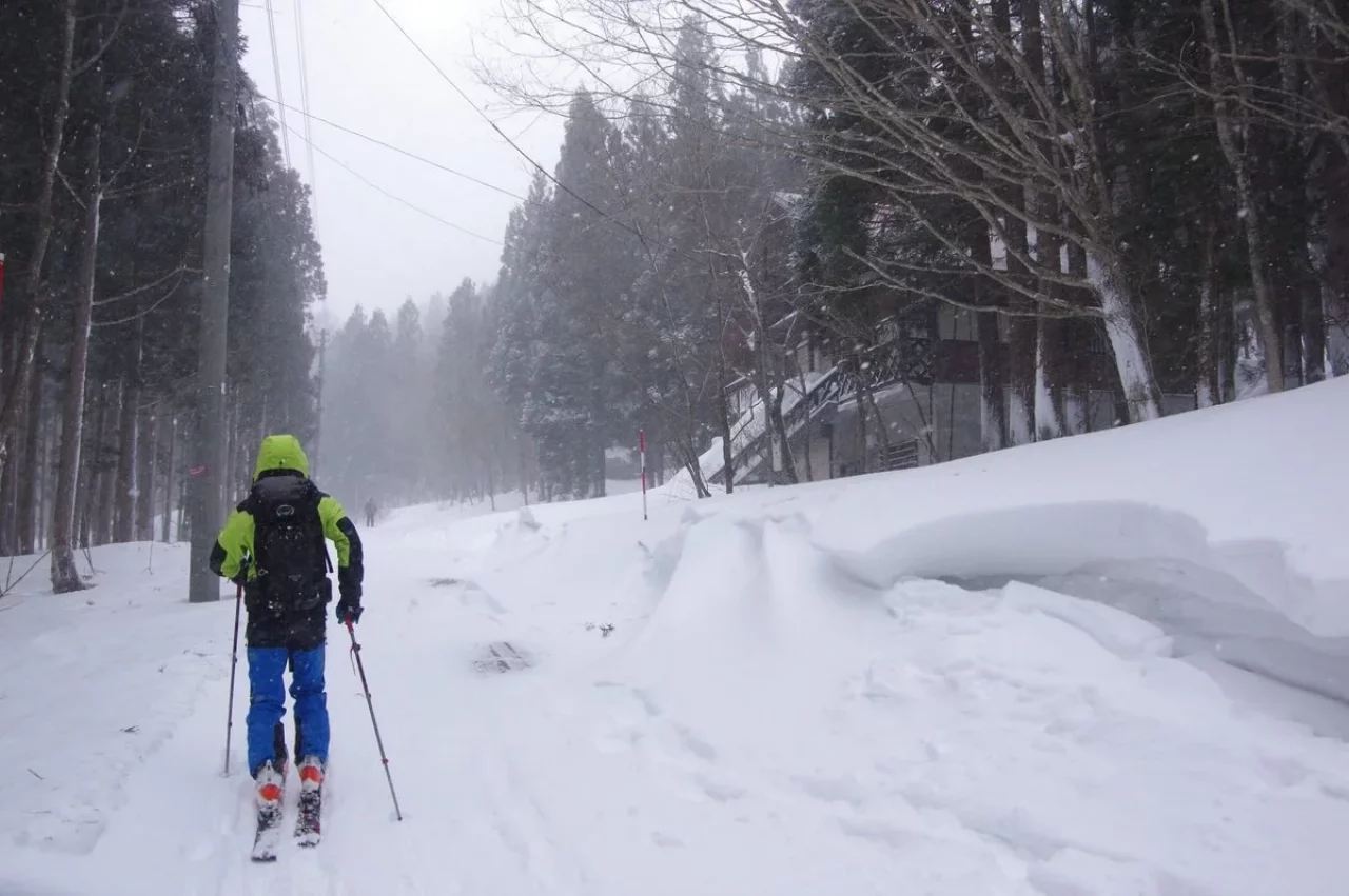雪を纏った別荘地の中を進み、いよいよヤカイ沢へ。ヤカイ沢ルートは積雪期にのみ利用可能なルート。夏の登山道とは異なり沢沿いをダイレクトに登るため、積雪量や雪質によってルート状況が大きく変化します。