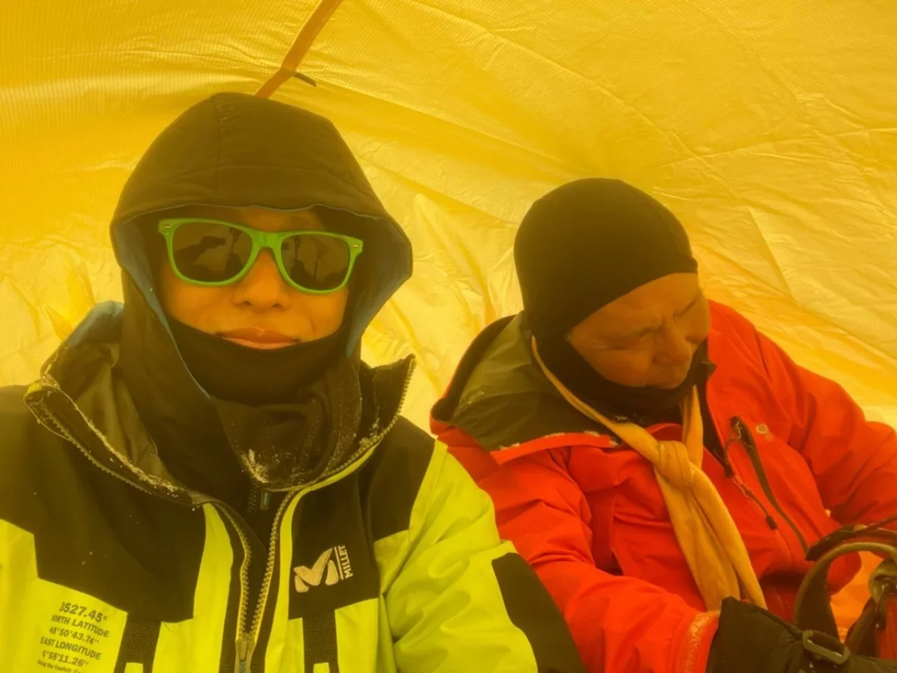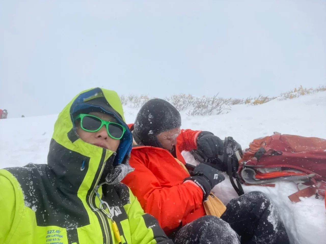 山頂にたどり着くとそこは別世界。爆風吹き荒れ体感温度は氷点下20度以下、顔を出すのも辛い。ガスに覆われ視界も無く、これでは滑るどころではない。そこで雪濠を掘って天候の回復を待つことに。