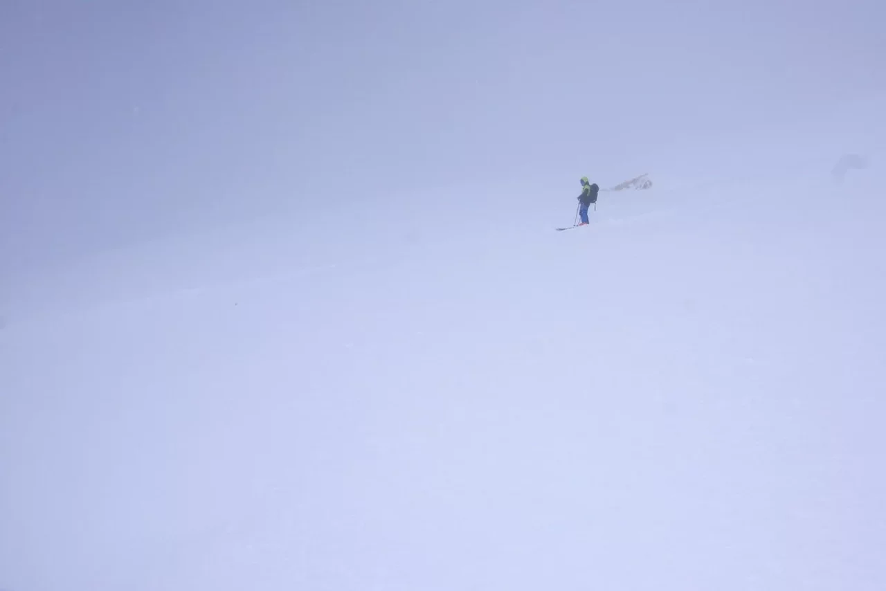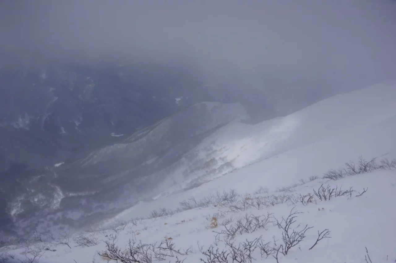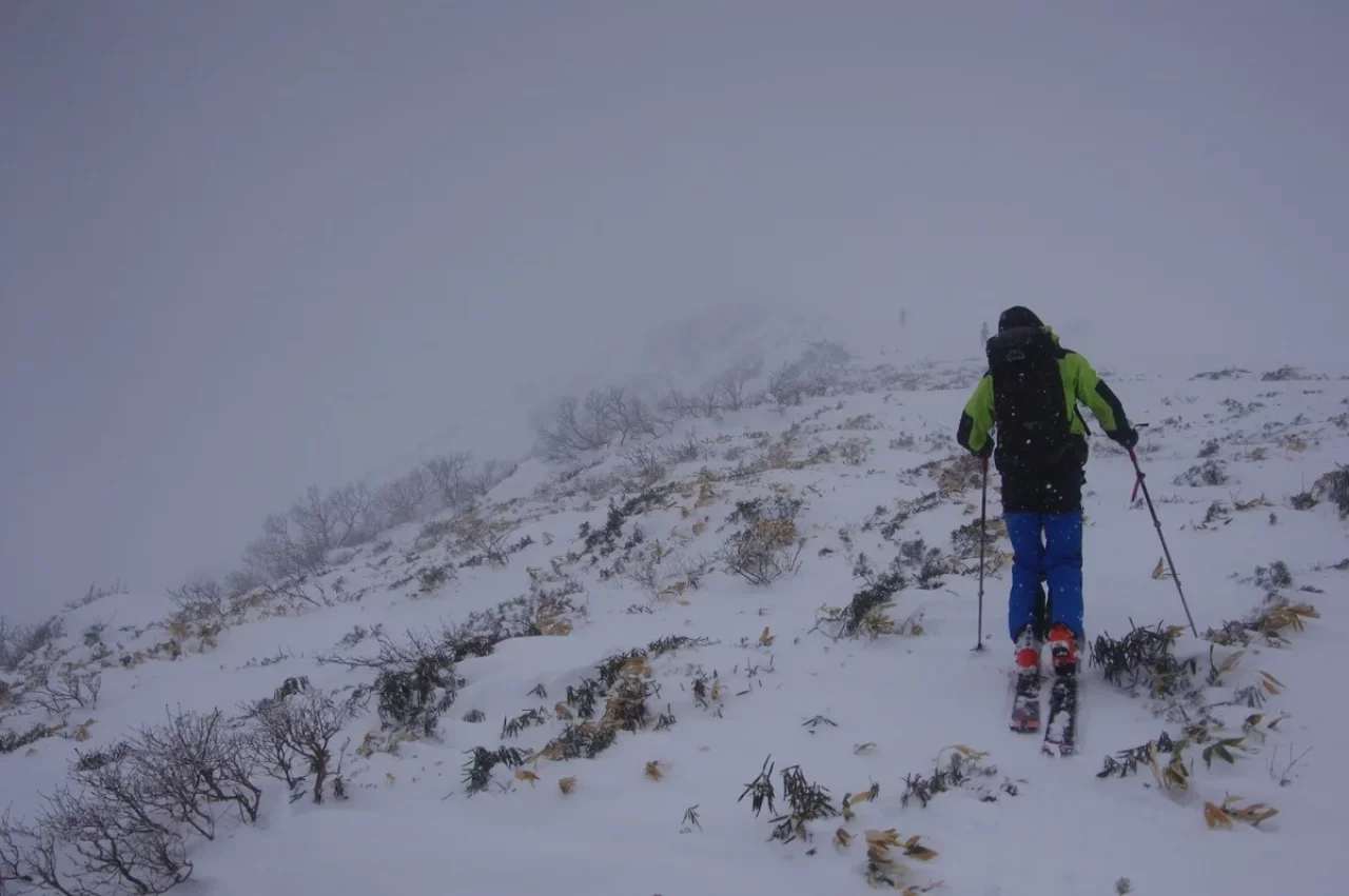 上部に行くに従い斜度は増し、強風で雪は飛ばされアイスバーンに近くなる。頼れるグリップなく滑落の恐怖で緊張の連続。スキーアイゼンを忘れたことを後悔するが、もう引き返すわけにはいかない。