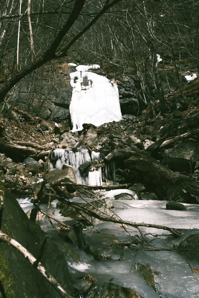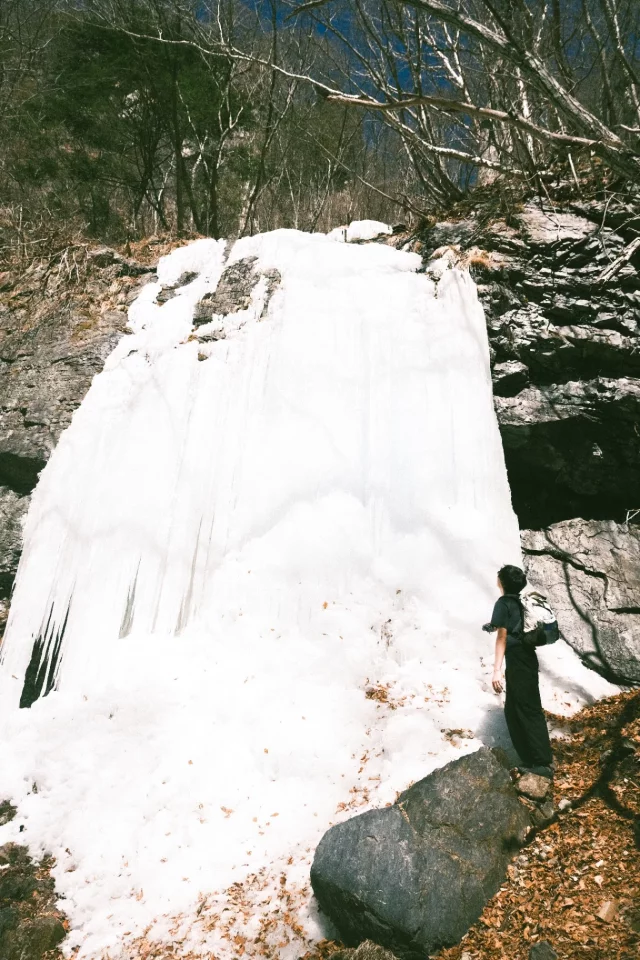 私も私で、自然の氷瀑をこんなにしっかり見たのはなんだかんだ初めてのような気がして、とても興奮する。滝から流れ出したその先の川も凍っているんだね。当たり前か?私の中には、小川全体が凍っているという発想がなかったので、とても驚いた。流れの瞬間が氷によって一時停止させられているみたい。なんて不思議な。しかし今日から春なので、溶け出した川が氷の上をチロチロと流れている。