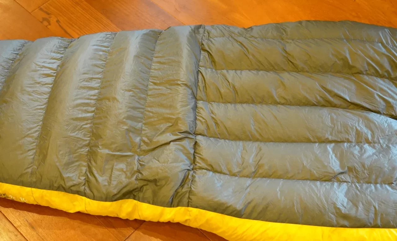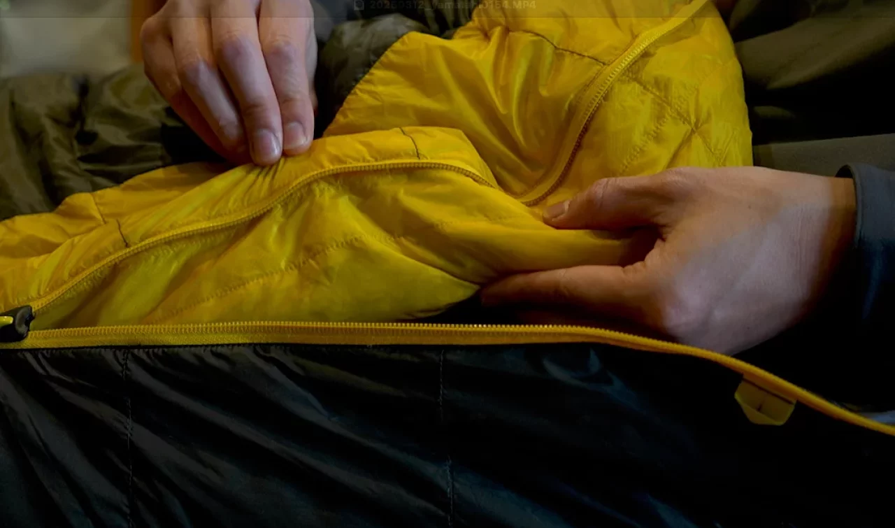 上半身は縦型バッフル構造でダウンの偏りを防いでいます。これは就寝中横を向いた時に、ダウンが横にずれることを防ぎますが、その分どうしても使用するシェル素材が多くなるため、下半身には横型バッフルを配置し、背中全体も横型バッフルになっています。
