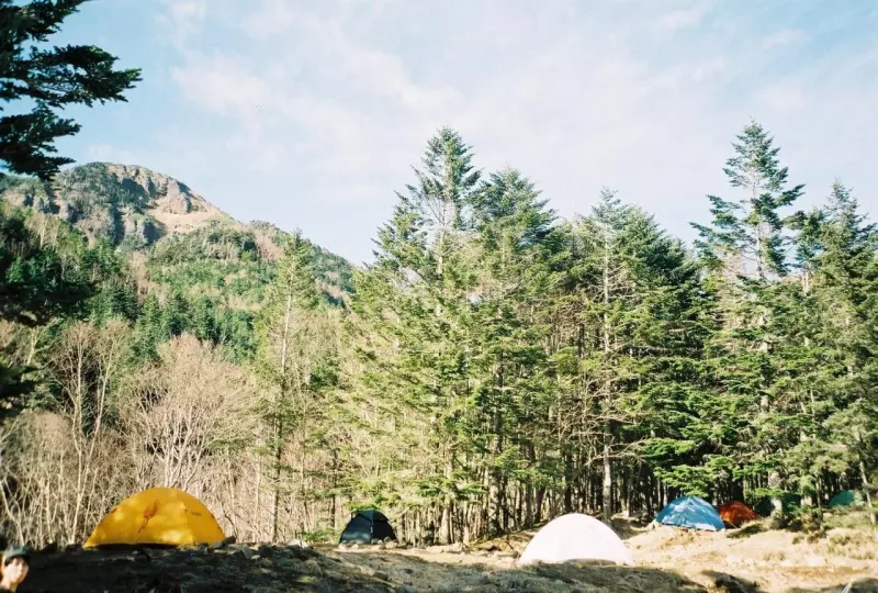 着いた時間は16時すぎ。時間のせいだと思うけど初めてのテン場は妙な静けさで、大声で喋ったらいけない図書館みたいな雰囲気。みんなでこの山の空気を守ってる感じがして神聖な場所な感じがした。