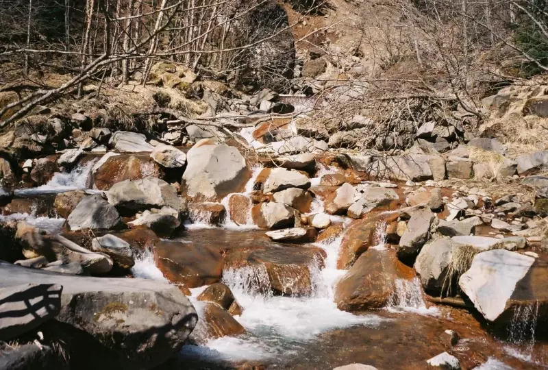 途中から登山道らしい森に入り、橋で川をあっちこっちに行き来するルートでとても楽しかった。川の音が心地良い。「硫黄岳」というだけあって、秋川渓谷の川と違って少し濁りがあるというか、白濁というほどではないけど少し色がついていて、綺麗。川幅自体は細いんだけど、流れが雄大で、音が心地よくて、色はカラフルで。鉱物の関係で川底はオレンジ色のところが多かった。石を触ってみると、手にオレンジ色がついた。時間が遅くなっているため山全体が若干夕日っぽい色合いになっているので、川の色とマッチしていた。