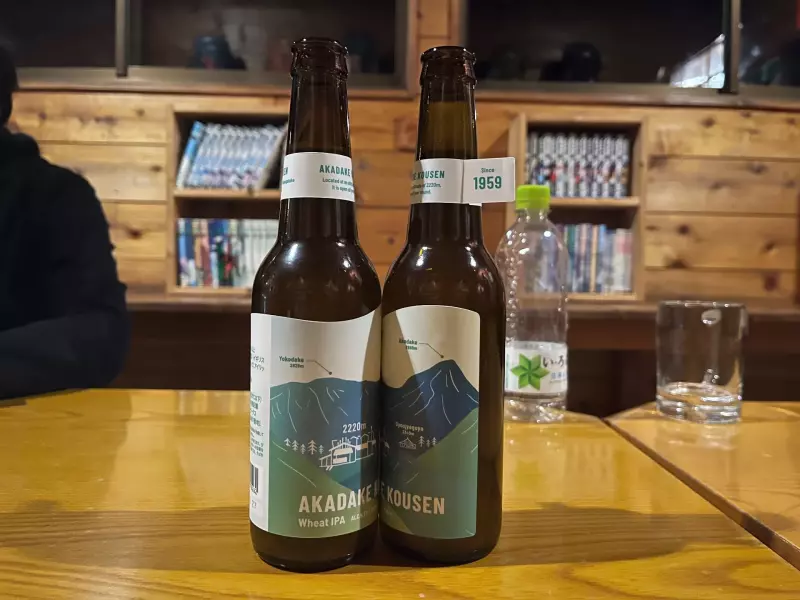 談話室、Wi-Fi繋げられてどんだけ便利やねんと思った。でもそのおかげで知り合った方々とSNS交換ができた。今回山では読書するつもりでKindleで本を購入していたけど、そこまでは叶わなかった。談話室で話しかけてくれた男性2人と話をした。YAMAP交換しましょうと言ったら、みんなYAMAPよりインスタをあげているらしく、今時みんなインスタなのかーと思った。その後、さっきのカップルも合流して話して最高の夜だった。知り合った男性が私たちに飲み物をご馳走してくれることになり、さっき売店で見て「いいなー」と言っていた地ビールを買ってもらった。2つ合わせると八ヶ岳の山容が見えるデザインだった。