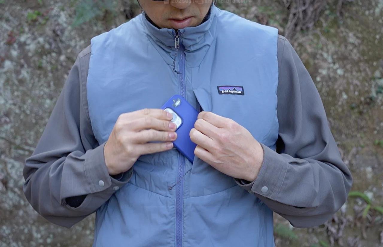 チェストポケットはスマートフォンを縦でも横でも収納できる正方形で、前から見た時にジッパーが隠れるデザインです。