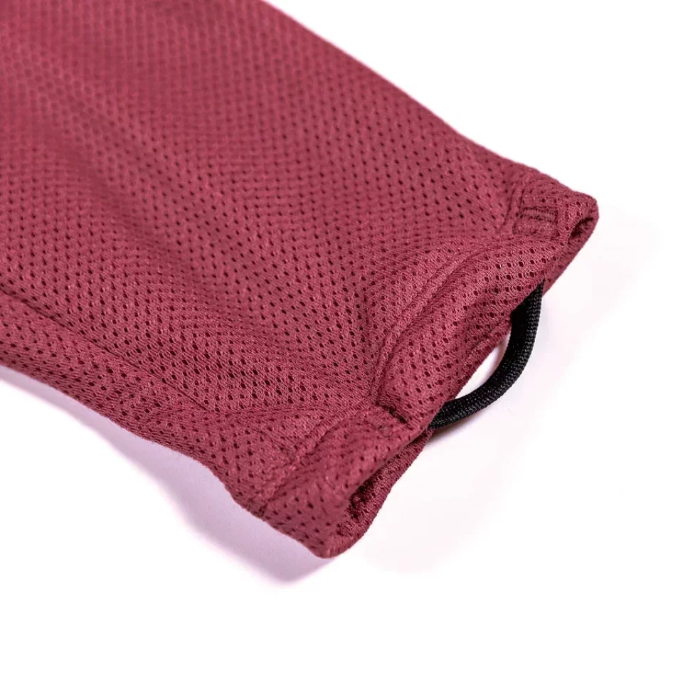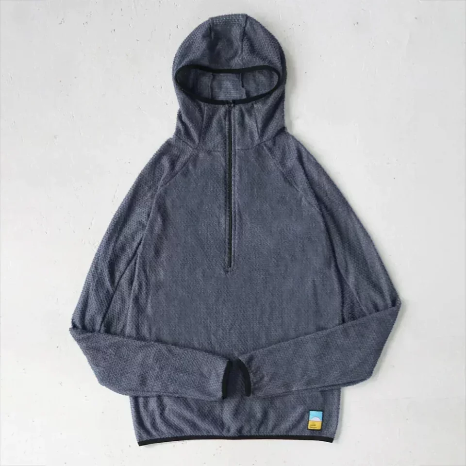 ハーフジッパーは胸元まで大きく開くので換気しやすく、手首にはサムホールがあるので冷気が侵入しません。裾のドローコードや首元の補強など随所にこだわりが見られます。