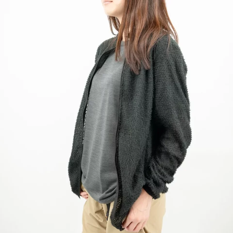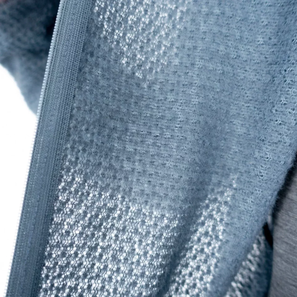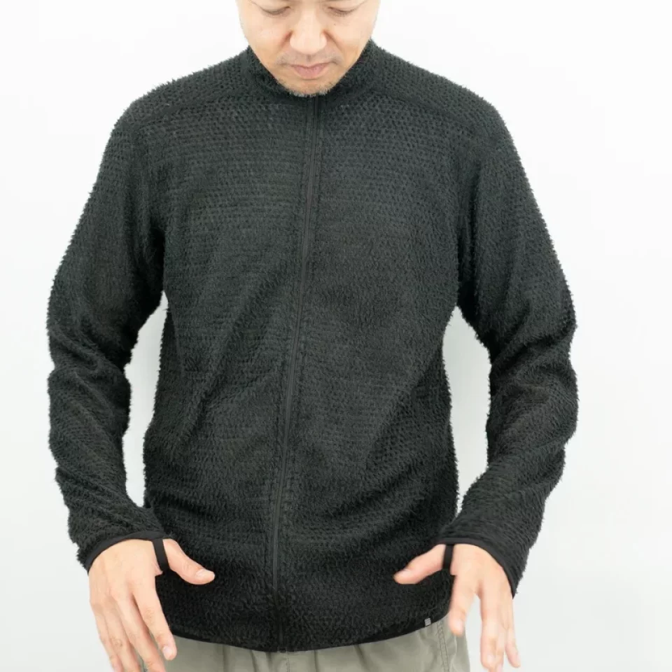 フリースに似た見た目で、非常に通気性が高く、汗をかいてもすぐに乾くため、ベースレイヤーの上にアウターとして着用するだけでなく、冬期のバックカントリースキーのハイクアップ時のように、脱ぎ着のしにくい環境下で、ミドルレイヤーとして着続けたまま行動してもオーバーヒートせず、快適性を保てます。