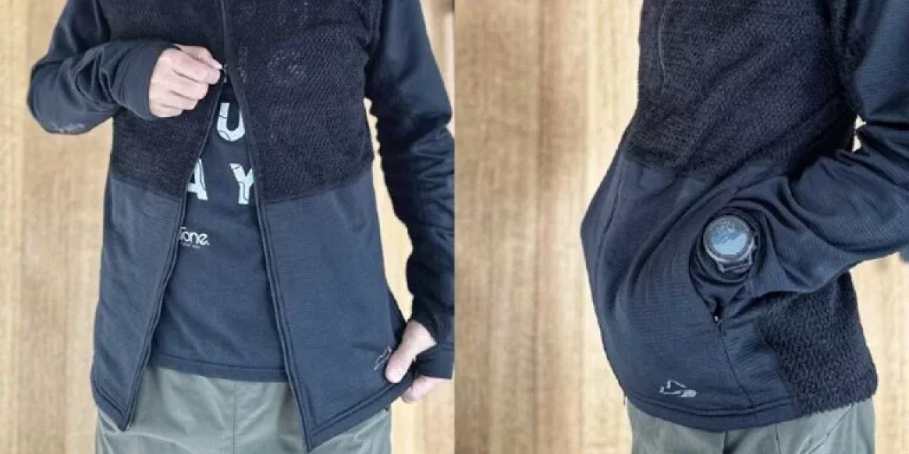 ハンドポケットはなく胸ポケットのみです。ストレッチ性に優れており、スマートフォンを入れた時にしっかりと固定します。また、サムホールがあるため、手首を温めることができます。