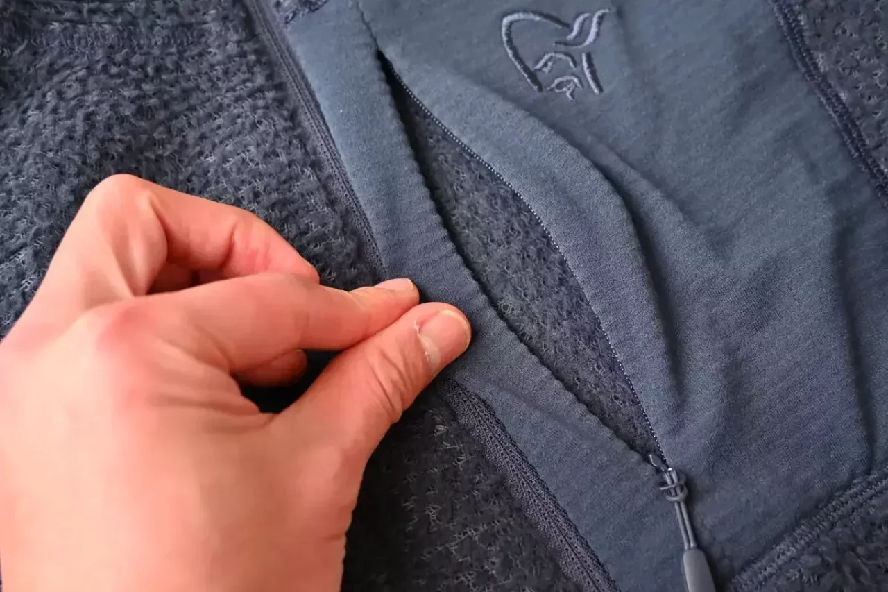 ミドルレイヤーとして着用しやすいフードなしタイプで、ジッパーは上下両方から開閉でき、ハンドポケットはザックのベルトに干渉しないよう少し高い位置に設けられています。