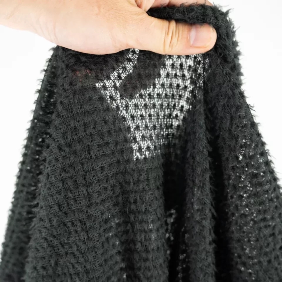 繊維が抜けやすく、耐久性の低い生地なので、無理に引っ張ったり、引っ掛けたりしないよう注意してください。