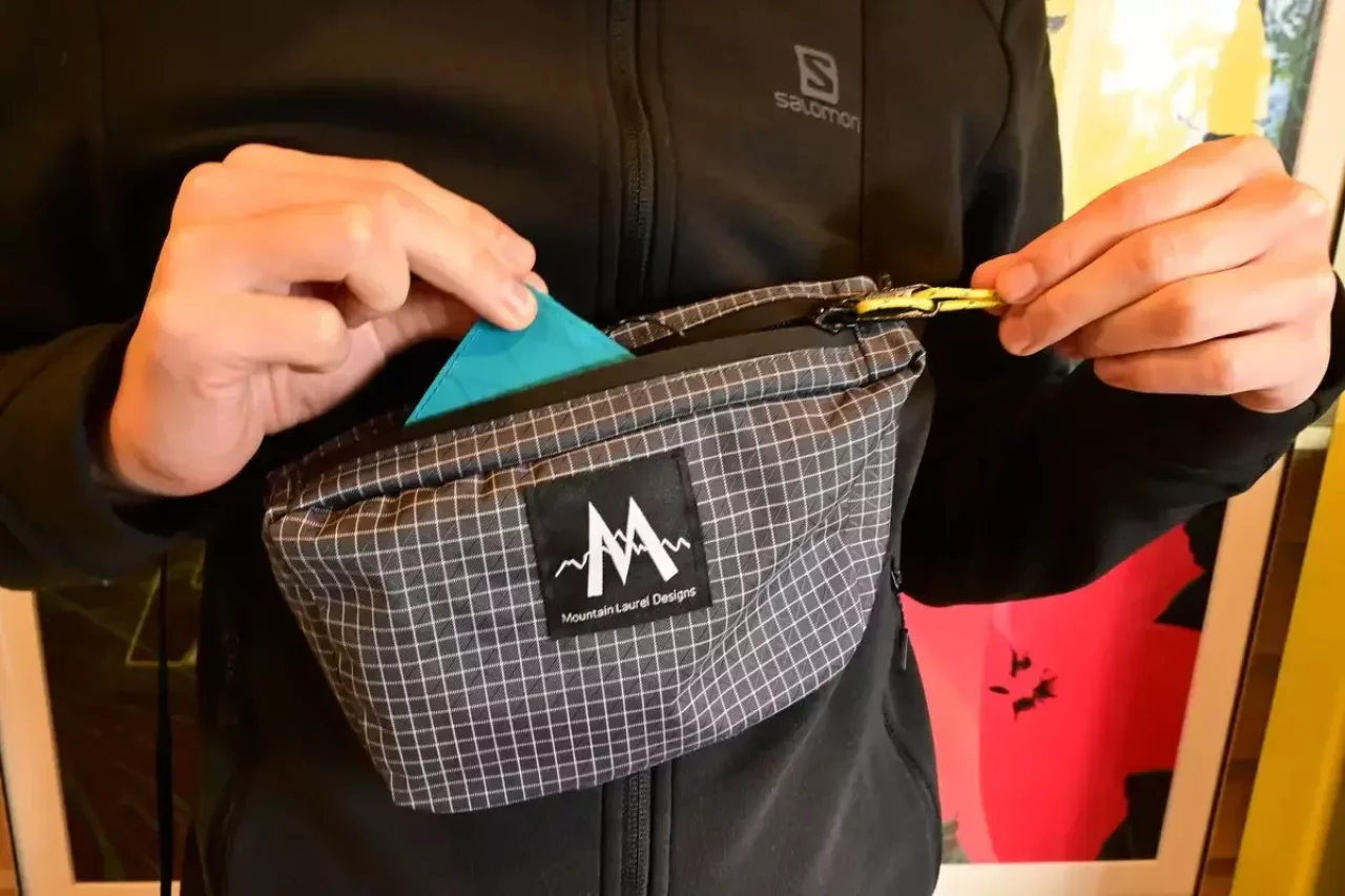 人気の秘密は、軽量性と絶妙なサイズ感、使い勝手の良さ、豊富なカラー展開にあります。圧倒的な軽量性と、耐久性、防水性のある生地を使用し、紙地図やスマホ、財布、行動食がスッキリと収まるデザインで、ベルクロテープで開閉するフロントポケットが特に紙地図の収納に適しています。