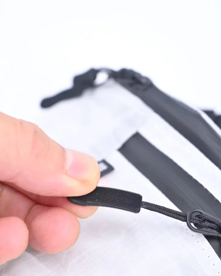 ショルダーベルトの一部に、テントのガイラインなどに使われるラインロックを使用しています。ラインロックのコードを引き下げたり引き上げたりするだけで、素早く簡単に肩ひもの長さが調節できるので、行動中、サコッシュが膝と干渉して邪魔になることがありません。