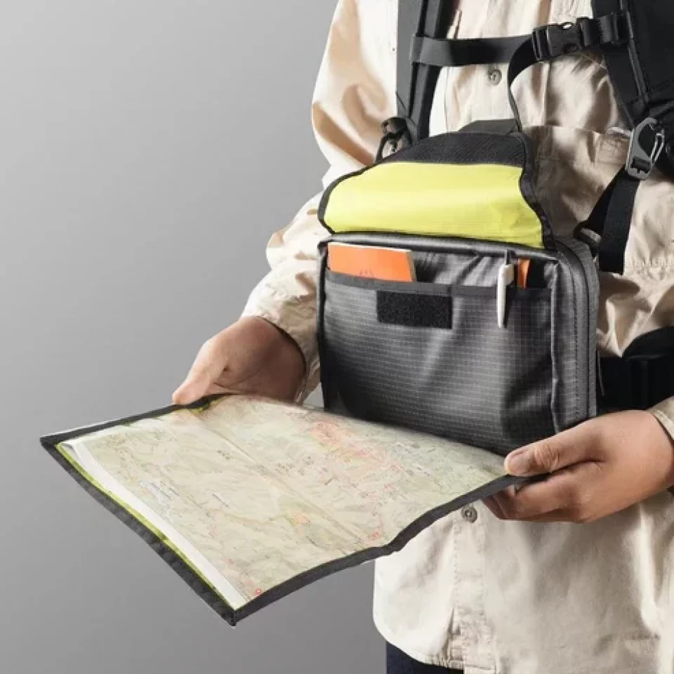 前面にA4サイズの紙地図が入るマップポケットを搭載し、行動中、地図を開いた状態で確認することができます。メインコンパートメントは5つのポケットで仕切られ、内容物を一覧できるレイアウトになっているため、欲しいものをすぐに取り出すことができます。
