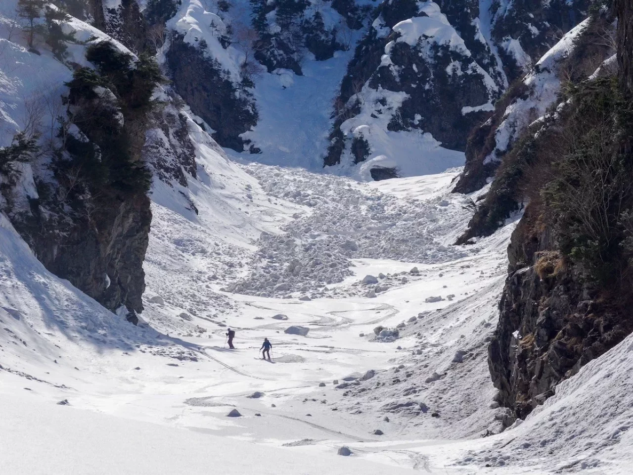 「流芯が狭まる喉元のところで、自分のスキーが落とすスラフから逃げられない地形になる可能性がある」