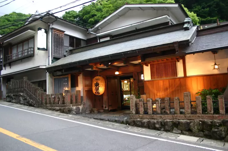 ・創業400年という歴史ある温泉宿「旅館 東学坊」。荘厳な佇まいの木造建築と天然の温泉に浸かれば心と体は至福のひととき。