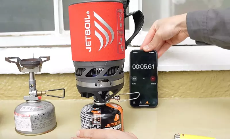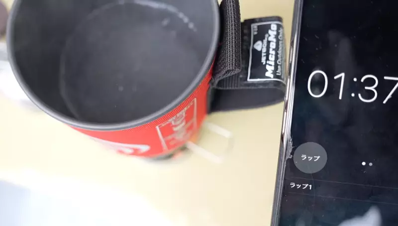 まずはじめにジェットボイルからスタートします。火をつけたら一気に最大火力にして沸騰するまでの時間を確認します。結果は1分37秒8。