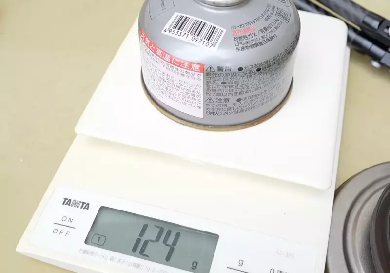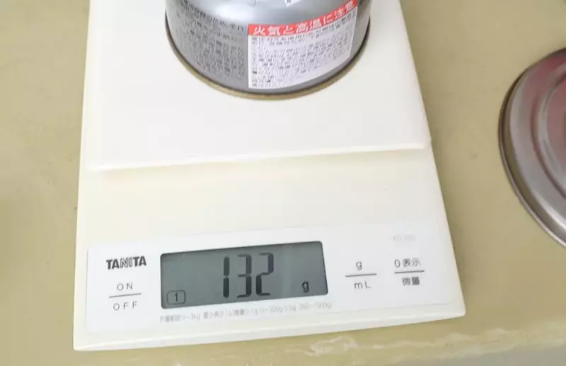 ガス缶の重量を確認すると、最初の重量が132g、沸騰後の重量が124g、差は8gです。