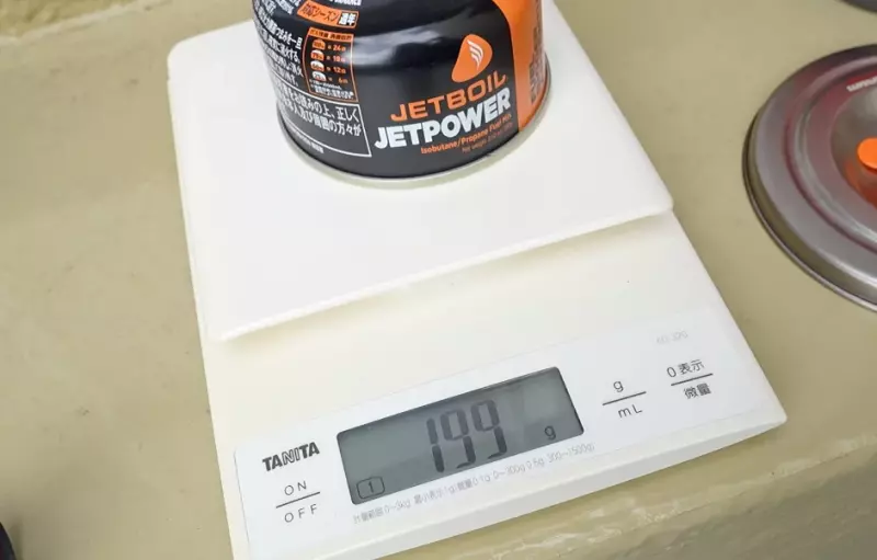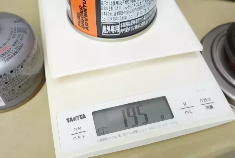 ガス缶の重量を確認すると、最初の重量が199g、沸騰後の重量が195g、差は4gです。