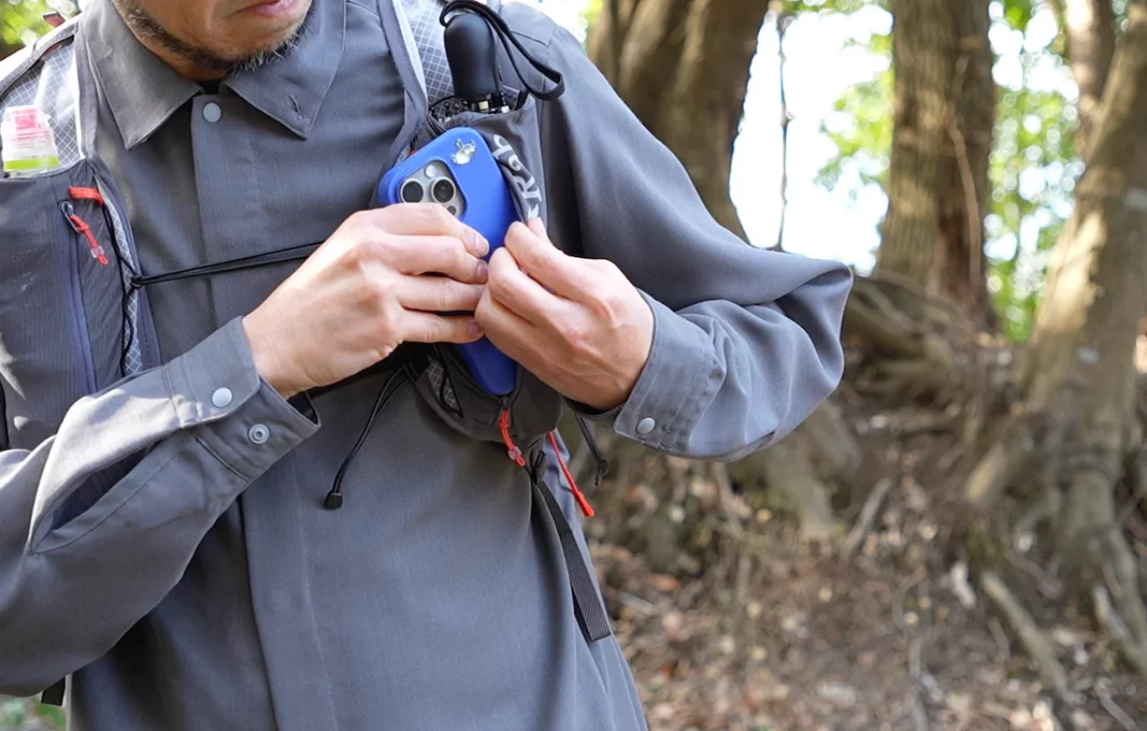 ショルダーハーネスには左右対称の縦型ポケットとジッパー付きポケットが備わっています。このポケットも同様のストレッチメッシュ素材で、例えばジッパー付きポケットにスマホを収納すれば、スマホを固定するような形で収納できるので、登山中にスマホが揺れて気になるようなことがありません。