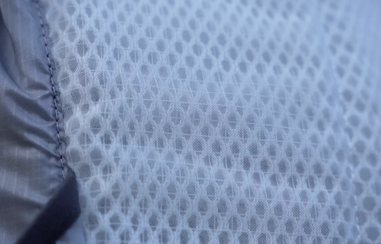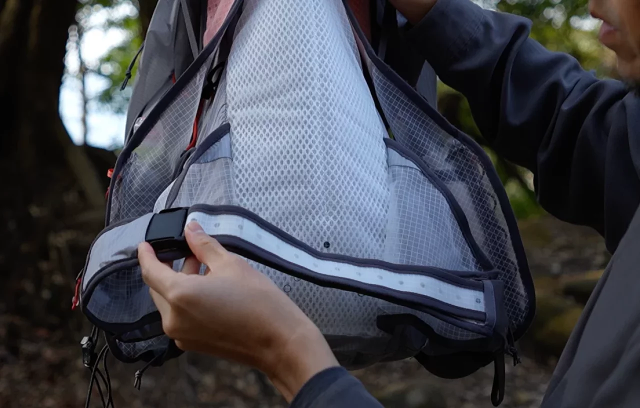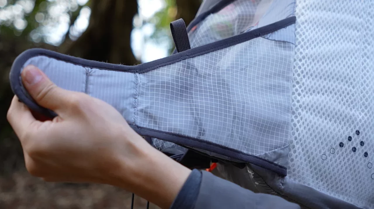 そしてショルダーハーネス、ウエストベルト、背面など体に当たる部分には超薄型モノメッシュを採用しています。モノメッシュは、トレイルランニング用シューズなどにも採用されている疎水性の高い素材です。疎水性とは新水性の反対語で、水と混ざりにくい性質があります。なので汗をかいても、雨に濡れてもザックが重くなりづらく、目の細かいメッシュ素材なので乾きが早く、ザックを背負っていて体に接触する部分が蒸れづらく涼しく快適です。