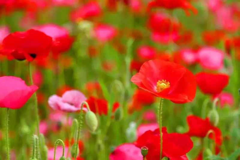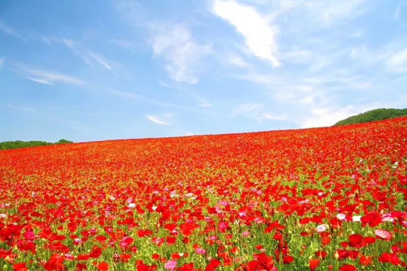 埼玉県秩父高原牧場(彩の国ふれあい牧場)には、約1500万本ものシャーレーポピーが栽培されており、初夏には美しい赤い花を咲かせます。