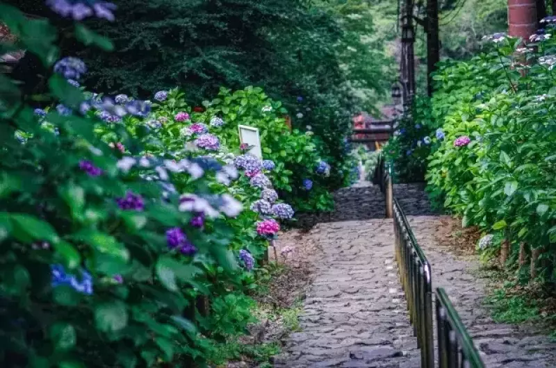 初夏は、山の中腹にある太平山神社へ向かう参道にあじさいが咲き誇ります。約1,000段の石段の両脇を2500株のあじさいが埋め尽くし、訪れる人たちを魅了します。