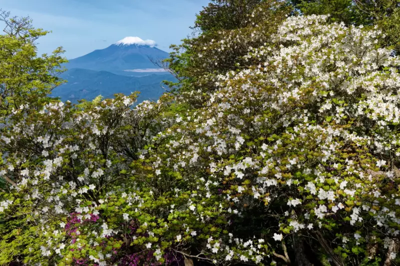 みずみずしい新緑に入り混じって、可憐なトウゴクミツバツツジの赤紫と、清々しいシロヤシオの純白が檜洞丸の初夏を彩ります。丹沢は年間を通して人気がありますが、5月下旬から6月上旬にかけての見頃の時期は、特に多くのハイカーが花を目当てに訪れます。
