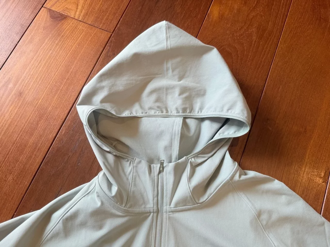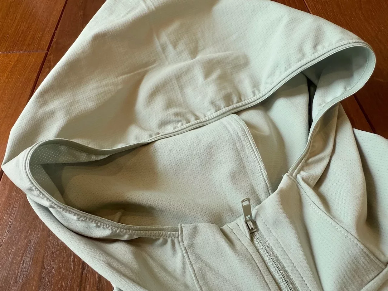 フードはシンプルなデザインで、大きすぎず小さすぎず、フィット感に優れているわけではないので、カバっと被って頭、顔全体を紫外線から守るような使い方が可能です。フード周りはストレッチテープが備わり、風によるバタつきを抑えてくれます。