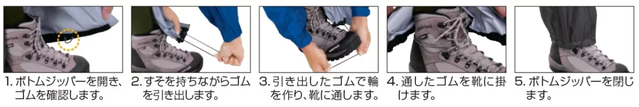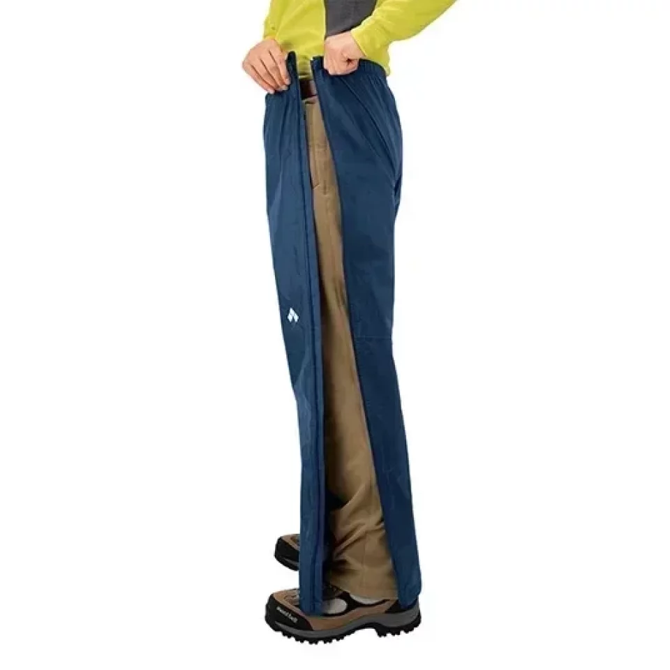 スーパードライテック レインパンツには、フルジップモデルもあり、急な雨にも登山靴を履いたままで素早く着用できます。